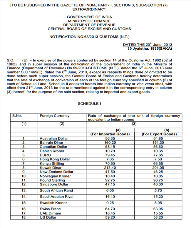 CA CS ICWA KNOWLEDGE HUB - Notification No. 63/2013-Customs (N.T.)-Rate of exchange of conversion of each of the foreign currency with effect from June 21, 2013